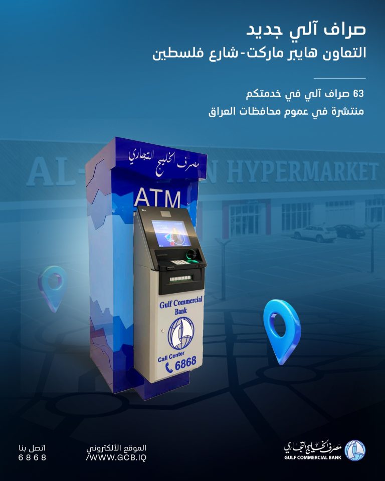 صراف آلي جديدفي التعاون هايبر ماركت -شارع فلسطين للتواصل والاستفسار : خدمة العملاء : 6868 الادارة العامة: بغداد – شارع السعدون – مقابل بدالة العلوية#مصرف_الخليج_التجاري#GULF_COMMERCIAL_BANK#تميُز_بالخدمة_ودقة_بالانجازلزيارة...