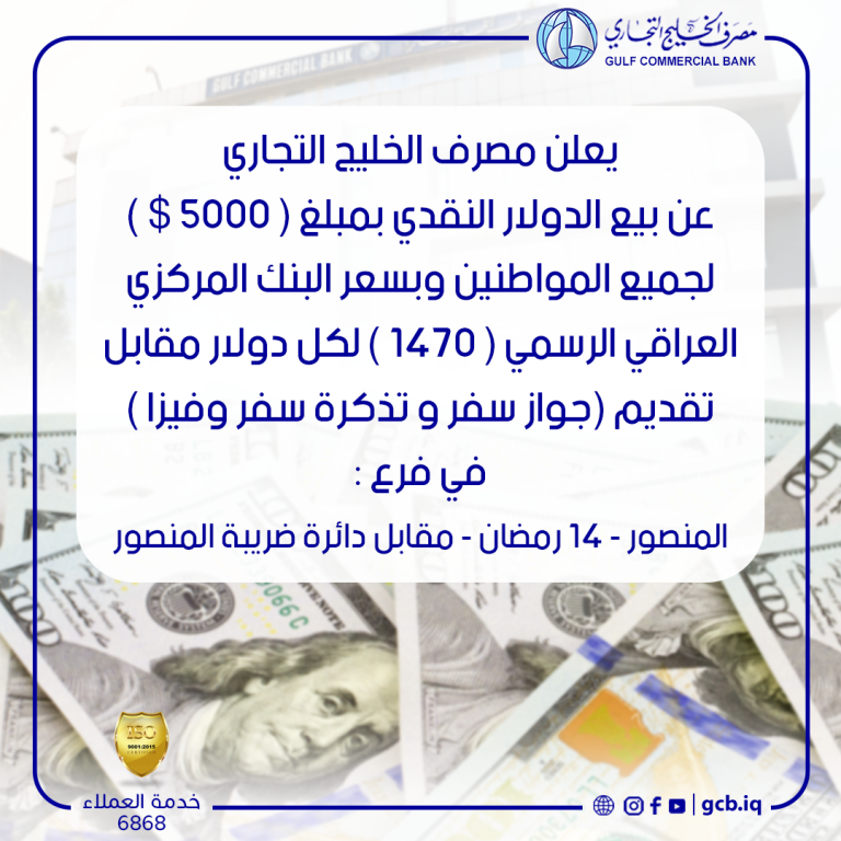 أستمرار توافد الزبائن على #مصرف_الخليج_التجاري – فرع المنصور لغرض شراء الدولار وبسعر البنك المركزي العراقي الرسمي ( 1470 ) لكل دولار مقابل تقديم ( جواز...