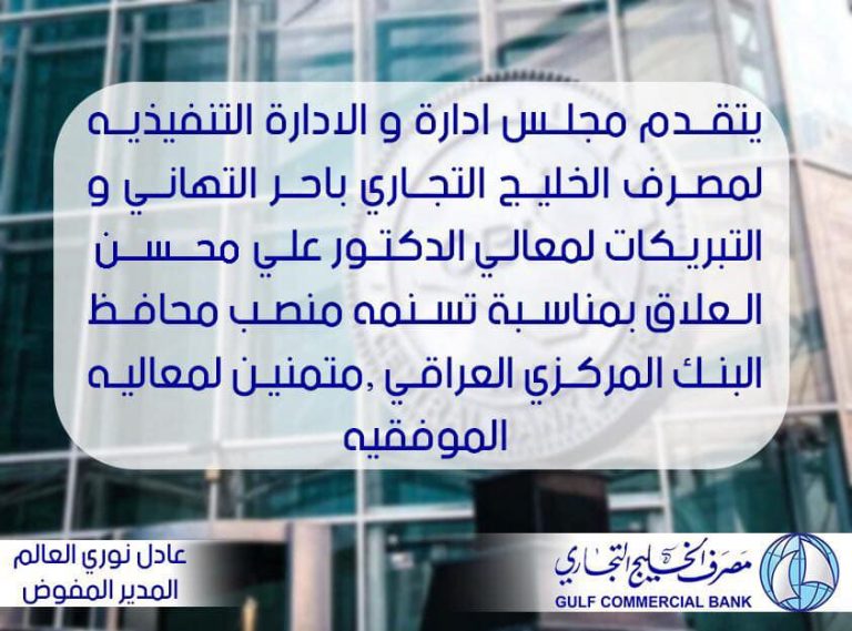 يتقدم مجلس أدارة والادارة التنفيذية لمصرف الخليج التجاري بأحر التهاني والتبريكات لمعالي الدكتور علي محسن العلاق بمناسبة تسنمه منصب محافظ البنك المركزي العراقي ، متمنين...